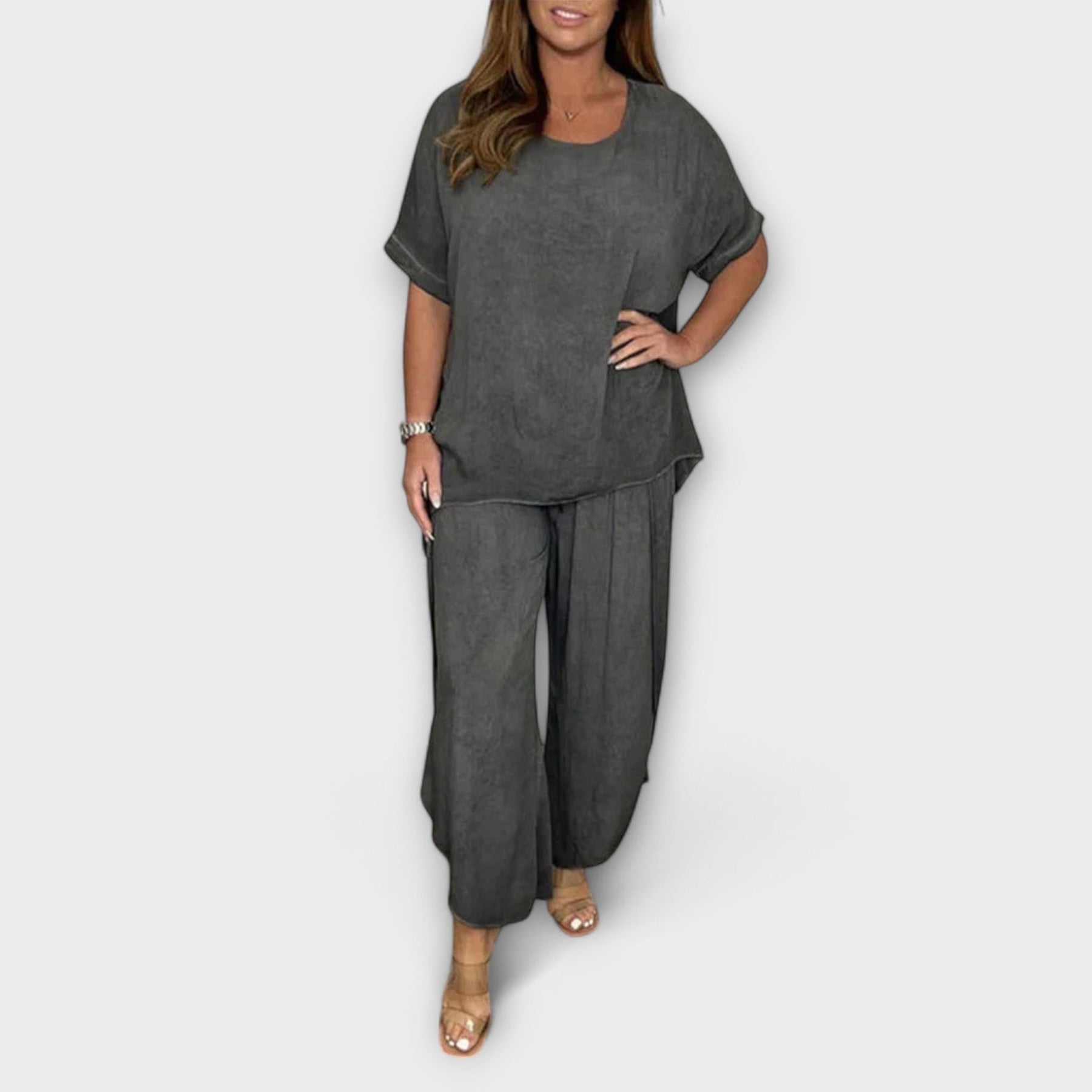 Objevte naši pohodlnou a uvolněnou dvoudílnou soupravu, která kombinuje jednoduchou eleganci s maximálním pohodlím. Ideální pro každodenní nošení, tento komplet spojuje volný top s pohodlnými dlouhými kalhotami – ideální na jaro, léto a podzim.