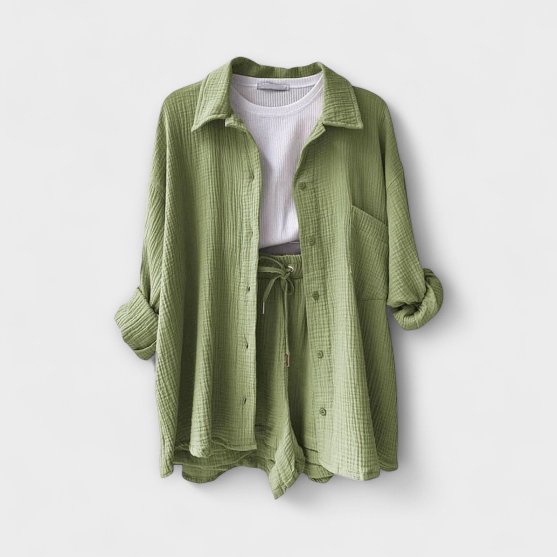 Victoria | Pohodlný 2-dílný set je dokonalou kombinací pohodlí a stylu pro váš šatník. Ideální pro teplé počasí, tento set je vyroben z prodyšných látek a má univerzální, elegantní design. Ať už se relaxujete u bazénu nebo jdete na neformální výlet, tento set nabízí lichotivý střih, který vás udrží v chladu a sebevědomí po celý den.