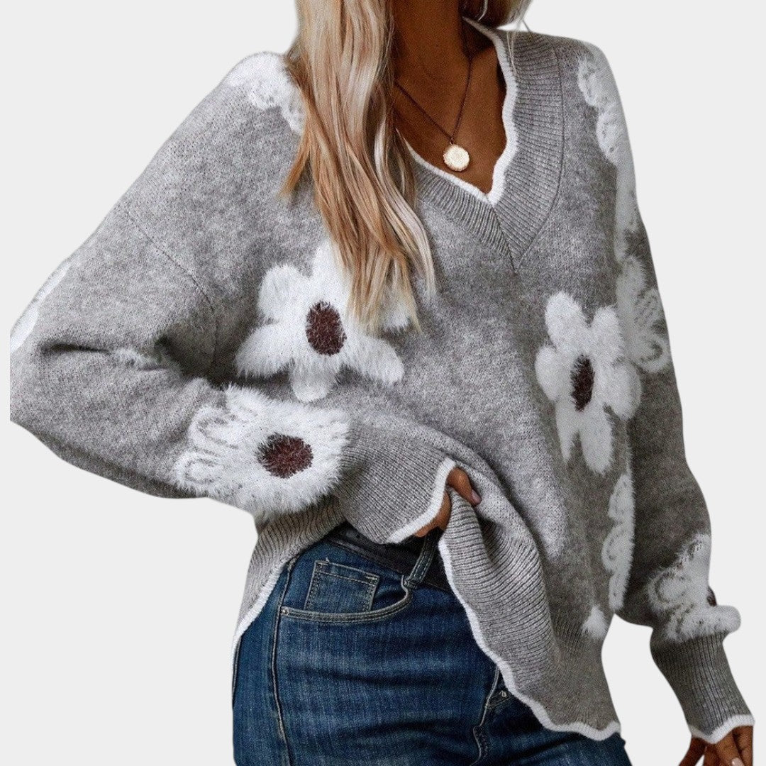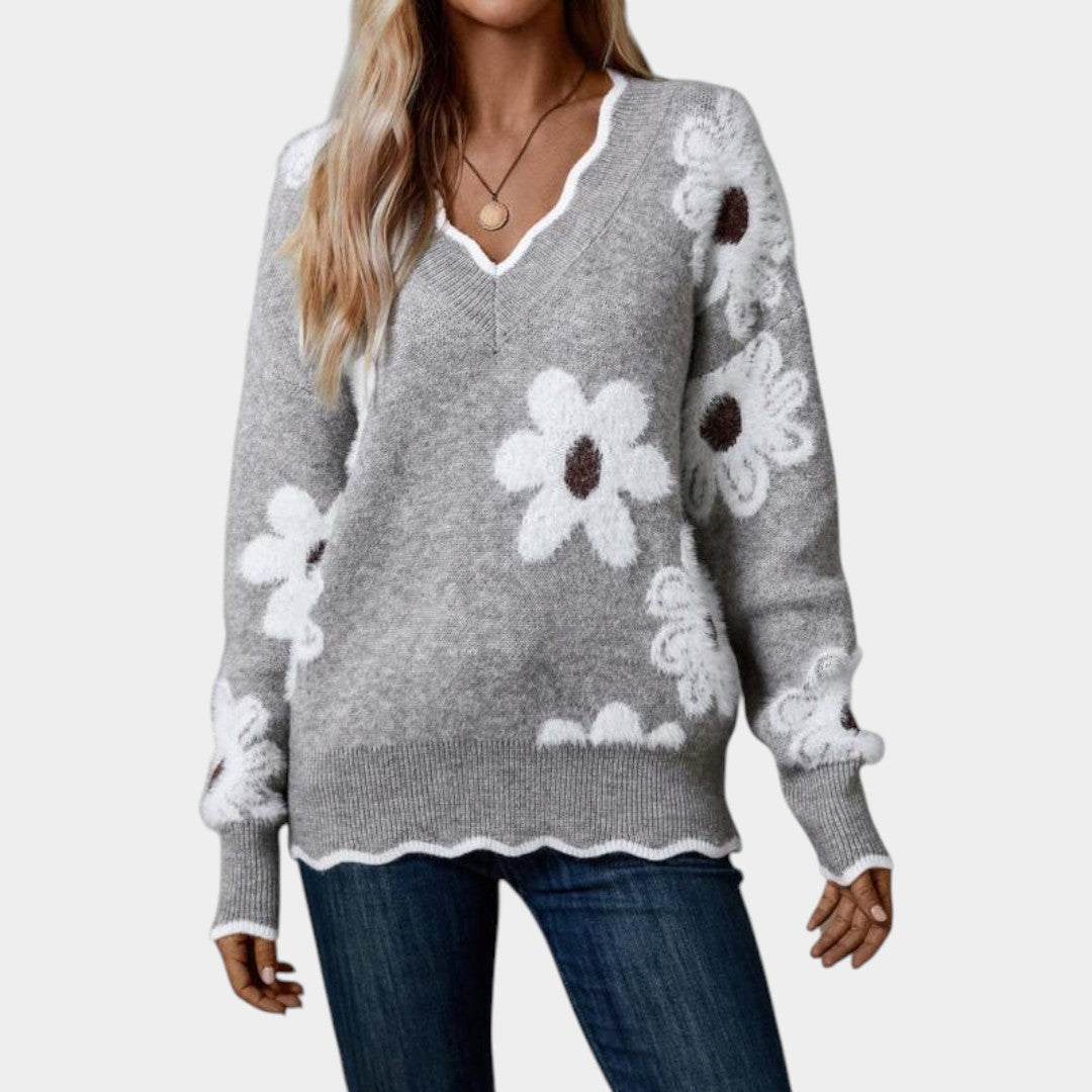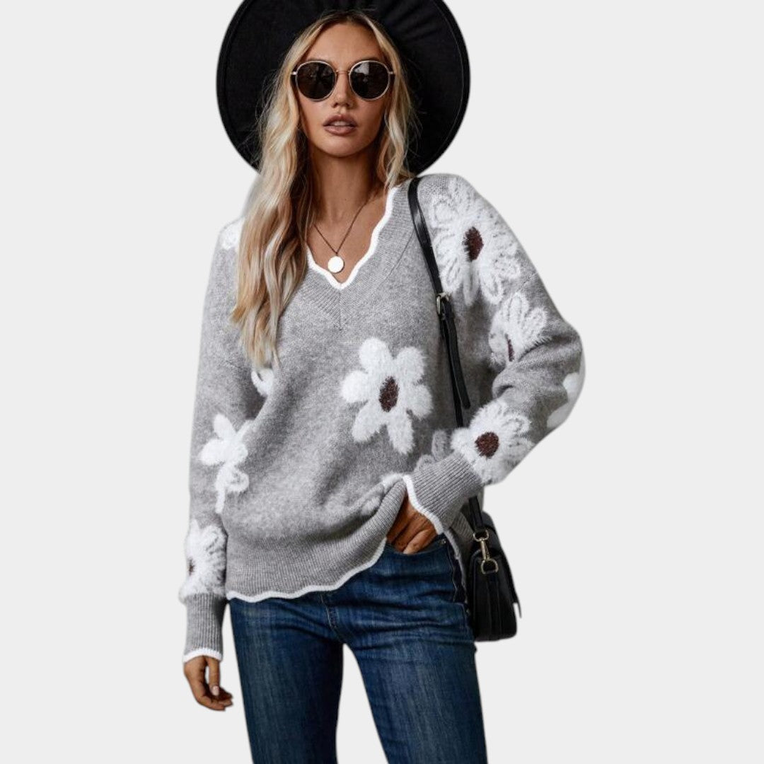 Klára je svetr, který spojuje pohodlí a ženský styl. Díky lichotivému V-výstřihu a jemnému květinovému motivu je ideální volbou pro chladnější dny, kdy chcete vypadat elegantně a cítit se pohodlně zároveň.